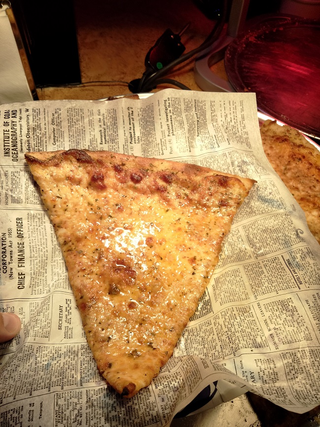 12/1/2022- A fantastic slice of thin new york style pizza! This pizza is fantastic! The crust is thin and crispy and chewy in all the right places. The cheese is on point and the crust is deliciously covered with garlic and buttery goodness! 10/10 would eat this pizza again! ~ Michael Taylor.