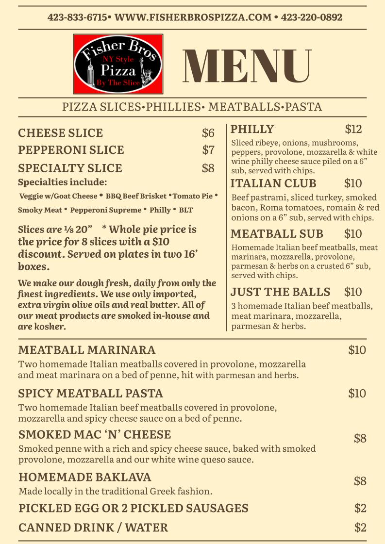 10/21/2022- I tried Fisher Bros Pizza and I am from Baltimore. I will say this was the best tasting pizza. I love the authentic italian taste. I am big on seasons and it was great. The size was perfect. I enjoyed every bite. I definitely recommend this pizza place. ~ Reda - ETSU Health